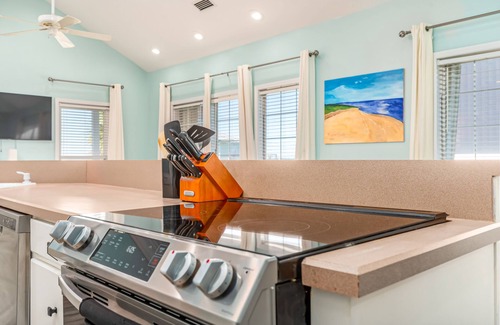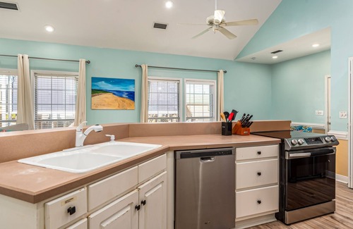 More outdoor space under the home features a picnic table and hammock that’s ideal for savoring coastal breezes. Extras include complimentary WiFi, central AC, and a private washer/dryer.