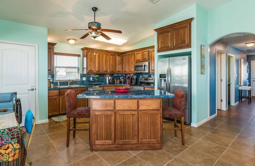 Decorated with vibrant prints and cheerful shades of blue, the living space features tile floors, plentiful seating, and satellite TV. Flip on the ceiling fans to circulate the Gulf breezes, use the stainless steel appliances to whip up pancakes in the kitchen each morning, and bring your coffee and newspaper outside to the wraparound deck to admire the Gulf view.