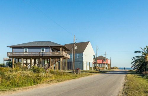 This elevated home overlooks the turquoise Gulf waters in Crystal Beach, a small community on the tranquil Bolivar Peninsula. Take a one-block stroll to catch the sunrise on the beach, hop on the Galveston-Port Bolivar ferry 11 miles west to cross the channel to Galveston Island, or spend your days birdwatching in the Anahuac National Wildlife Refuge 35 miles northeast.