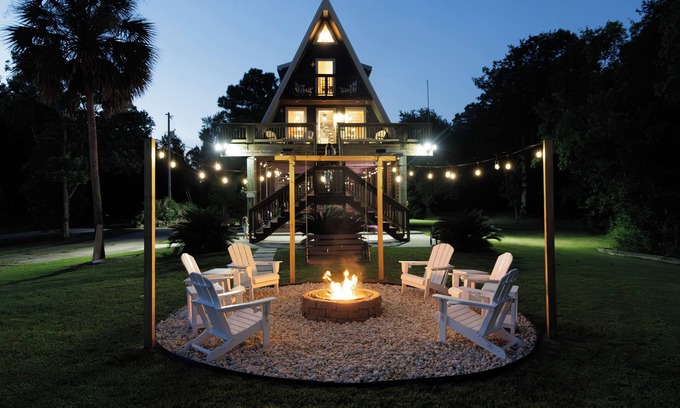 Newly remodeled luxury A-frame cabin in Ocean Springs, MS, with Gulf views. Sleeps 7: king bed, queen bed, 2 twin beds, futon. Full 2nd floor with extra loft space, 2 baths (1 full with spa shower, 1 half). Game room with pool table, air hockey, foosball, ping pong, dartboard, 3 Roku TVs. Fully stocked kitchen, coffee/tea bar, BBQ grill, wrap around porch, 2 balconies, Tesla Charger. Fire pit for cozy nights! Walk to pier with pavilion, boat launch, beach. Close to Downtown Ocean Springs!