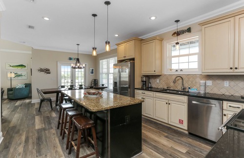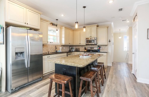 - Kitchen - fully stocked chef's kitchen with granite counters & island that seats 4, stainless steel appliances, blender, coffee maker, coffee grinder, microwave, dishwasher, refrigerator/ice maker, electric stove & oven, toaster, crock pot