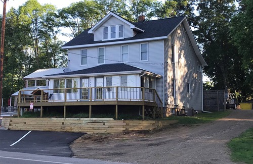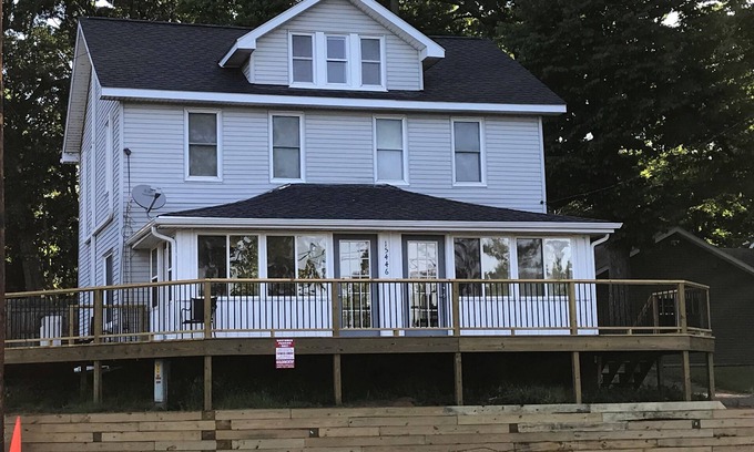 All furnishings in the house were brand new in 2017. The enclosed porch is lined with windows that overlook the boat launch (across the street), and there is a pizza restaurant next door.