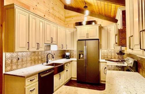 An OPEN CONCEPT BRAND NEW CUSTOM DESIGNED MODERN FARMHOUSE KITCHEN w/CAESARSTONE COUNTERS & extra deep FARM SINK has its new CUSTOM WOOD CABINETS stocked from salt & pepper to pots & pans as well as a Keurig, 2 coffee makers, a STARBUCKS ESPRESSO/CAPPUCCINO machine, 2 toasters & all the tools you’ll need to make a delicious meal in this NEW GOURMET COUNTRY KITCHEN w/all NEW matching GE SLATE APPLIANCES to include a NEW FRIDGE w/Icemaker & Water Dispenser, a NEW STOVE w/Air Fry & SABBATH MODE too, a sleek NEW MICROWAVE, an ultra quiet NEW DISHWASHER & even a large capacity WINE FRIDGE in the open floor plan ENTERTAINING/DINING AREA that seats 8 & a LIVING AREA w/a WOOD BURNING FIREPLACE, a 42 inch FLAT SCREEN HDTV, Sony Blu Ray HOME THEATER system w/surround sound, Apple TV, +, Disney+, & Netflix, UNLIMITED HIGH SPEED WIFI & a land line CABLE PHONE w/unlimited North America & Puerto Rico calling, all beauty & comforts of the new reimagined Le Chalet to be enjoyed while being enveloped by vaulted 18 FOOT KNOTTY PINE CATHEDRAL CEILINGS & 13 OVERSIZED WINDOWS facing East, South & West for a PANORAMIC VIEW of breathtaking WINDHAM MOUNTAIN, all day SUN & an all night MOUNTAIN BREEZE.