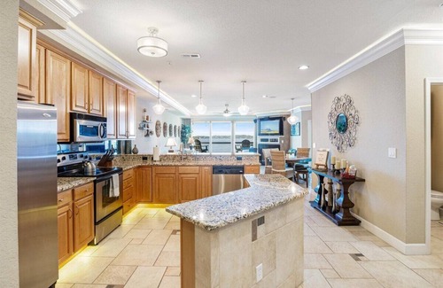 This condo has 3 bedrooms and 3 full baths. It will be quiet because we have "BAFFLED SOUND REDUCING GLASS". No shower curtain here, but glass doors. The master suite features a high quality "Casper Wave" king bed with a base that allows you to elevate your head and feet. The base also has "ADJUSTABLE MASSAGE LEVELS" (with timer) for both the head and feet. The master bath has double sinks, a jetted bath tub as well as a large walk-in "STEAM SHOWER". The second bedroom offers a king bed with access to a private second full bath. The third bedroom offers two twin beds and has access to the 3rd full bath. Both master suites, as well as the balcony, have flat panel TV's. The kitchen and living room area have indirect lighting, which enhances the "CROWN MOLDING", giving the space a soft, luxurious feel.