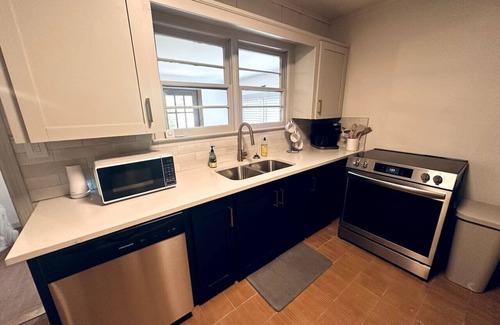 Family-friendly, fully remodeled 3-bedroom, 2 bathroom home with easy highway access. Primary room has private on suite and king sized bed. One bedroom has a full sized bed and is located close to shared bathroom. Third bedroom doubles as tranquil office space or nursery with Pack`n`Play, changing table and nursing chair. Beautifully updated kitchen with professional oven/stove, dishwasher and fridge/freezer. Large laundry. Fully privacy fenced yard. Carport parking!