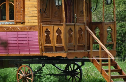 Vacation in a real gypsy caravan in the middle of a stable of twenty horses.