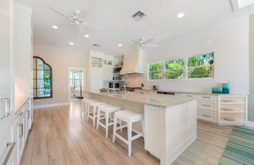The gourmet kitchen is a chef's dream, equipped with modern appliances, a double oven, a built-in Subzero refrigerator, a Keurig coffeemaker, and plenty of counter space. A dining table with seating for 10 allows for memorable meals with your loved ones. A propane grill is available on the pool deck for island cookouts.