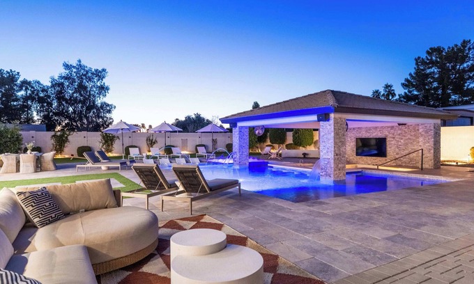 Book with HÓZHÓ Scottsdale—Where Extraordinary Begins. This modern $5 million, 7000+ square foot estate has 9BR, 9BA and features a private resort style backyard with pool, hot tub, water features, sunken ramada and a pickleball court. Inside find an 80k commercial golf simulator w/sports suite, chefs kitchen, billiards and more!