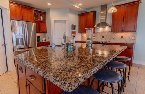 The master bedroom has a king-size bed with a large ensuite master bath, a walk-in closet, and a TV. It overlooks the lake with access to a large deck that’s shared with a second bedroom that has a king-size bed. The third bedroom is on the same floor as the master and it has a bunk bed with a double, single, and trundle single pull-out. On the first floor, is a room with two single bunk beds, and a queen-size pull-out couch and TV in the open family room. A pack-n-play for an infant is also available.