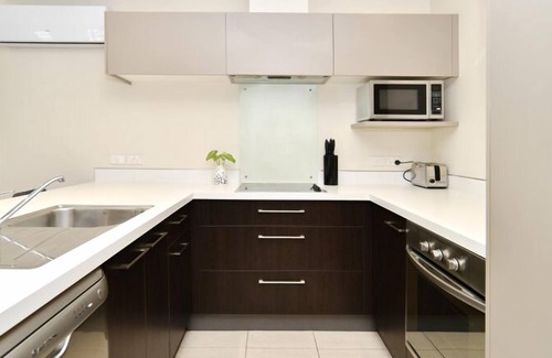 The sleek apartment comes with 4 bedrooms, 2 bathrooms, a private courtyard with a lawn, a fully-equipped modern kitchen, an open-plan living area, a full lounge suite, a full dining room, a garden, a laundry, and an outdoor seating area with a BBQ.