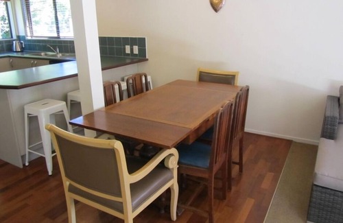 Hahei Beach Road Bach is just a short drive from Hotwater Beach and Cooks Beach. This bach is centrally located to many of the tourist destinations of the Coromandel Peninsula. Hahei Beach Road Bach is an airy and sun-filled 3 bedroom house with open-plan living. Both the master bedroom and double bedroom have the benefit of an ensuite each. The double bedroom also has a separate nursery attached which has a portacot, highchair(attaches to a bench) and foam mattress suitable for children supplied. The bunk room has 2 bunk beds and a pull out rollaway bed. There is a separate toilet in the laundry right next door to the bunk room for these guests to use. Hahei Beach Road Bach wraps around a central shaded deck which ensures great indoor outdoor flow. There is plenty of space for vehicles as a lockable garage and open carport is attached to the house and room in the driveway for more vehicles. The key feature of Hahei Beach Road Bach is its location with Hahei shops, restaurants and playground directly across the road makes this an awesome spot for families to walk everywhere. The beach is a flat 4 minute walk away and there is an extra outside shower to use on your return. The garden and deck offer privacy for a peaceful breakaway, or head out to the beach for sun and surf.