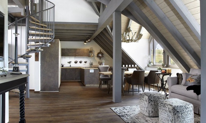 Edler Wohnraum mit großem Lounge Sofa im Landhaus Look, die Feuerstelle mitten im Zimmer, dies alles mit einem endlosen Ausblick bis in die Schweizer Alpen. Die Schlafräume warm und kuschelig, ein Badezimmer, welches träumen lässt. AUSSTATTUNG - Maisonette 3 Schlafzimmern und zusätzlichem Bad/Dusche/WC - Küche mit Tapanaki Grill, Wog, Induktion, und einiges mehr welches diese Eventküche zu bieten hat. - Kamin mit Bioethanol - Wintergartenbalkon - Bad mit freistehender Badewanne - Sep. Gäste WC Weitere Highlights: Nach einem entschleunigenden Tag können Sie in unserem kleinen aber feinen Spa-Bereich entspannen und auch körperlich entschlacken. Eine Spa-Landschaft für alle Sinne: Dampfbad, Finnisch,- Kräuter- und Infrarotsauna, Whirlpool und Swim-Spa sorgen für Erholung und Vitalität. Während Ihres Aufenthalts bei uns dürfen Sie neben unserem Spa-Bereich viele weitere Highlights erleben und genießen: hauseigene Bowlingbahn, Barlounge, Käsefondue, BBQ am Tischgrill, Rehkirrung mit Schneeschuhen im hauseigenen Jagdrevier, Ansitz und Pirsch für Jäger und Wildbeobachter buchbar.