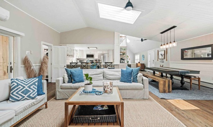 Hale Pau Hana is a 3 min stroll to Lake Winnipesaukee via our private association beach. The unpaved area around the neighborhood is private for homeowners and guests. Golf carts and scooters or motorcycles are permitted just no quads (ATV). The area is quiet and nice for a morning or evening walks. There is a private association beach available for having a picnic, kayaking , swimming or sunbathing. There is a tennis court, basketball and beach volleyball available for guests. As well as a small playground for the little ones. The beach has 2 dumpsters for use for household trash. In the summer and fall there are portable potties located at the beach. The area next to the bridge is a public beach with a boat dock and it is a nice walk to other picnic areas and places along the lake. In the spring summer and fall there is a small grocery store nearby (JoJo’s) that has a nice butcher, deli and other household items. Elvios Pizzeria in Center Harbor delivers to our address when they are open.