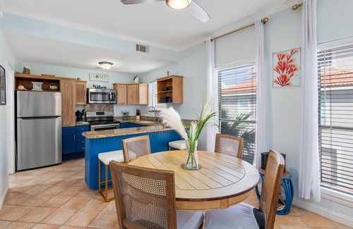 Just 2 minutes from the best beach in Texas! This adorable 1 bedroom, 1 bath will sleep 5 with a queen bed, twin bunk beds and a sofa sleeper. You will have everything you need for you home at the beach, full kitchen with all necessities, utensils, microwave, dishwasher, pots & pans, coffee maker, blender, toaster, an assortment of spices and more! We will provide all linens and towels, soaps and shampoos, paper towels, extra toilet paper, trash bags, makeup towels as well as beach towels and even beach chairs! Stairs are required to get to the second floor. 1 Assigned parking spot. Only half a block to the beach access. Two small dogs allowed with $100/dog cleaning fee. NO POOL AT THIS COMPLEX. PLEASE READ ALL OUR REQUIREMENTS IN OUR HOUSE RULES.