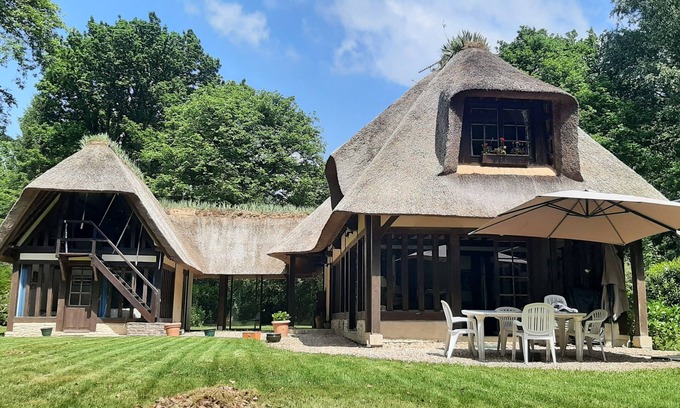 On a 2600 m² plot, this 145 m² half-timbered thatched cottage, composed of two buildings, is surrounded by a flowered and wooded garden. Its location in lush greenery, close to the many services of the domain and Pont l ' Bishop, make this place a unique vacation spot combining authenticity, charm and functionality.