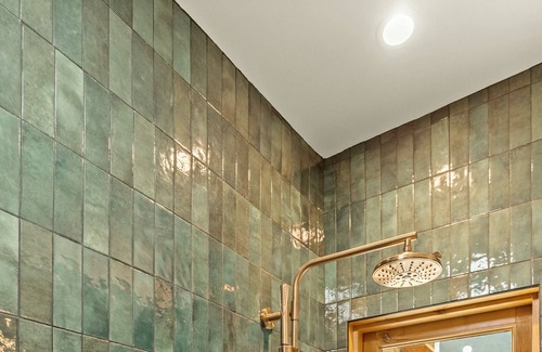 The bathroom on the main dwelling is another sight to behold, complete with wonderfully teal and textured walls, contemporary lighting, and elegant aesthetics. Get ready for a night out while you bask in the space or unwind under the shower while you're enveloped in the mood and stillness of the town you're in.