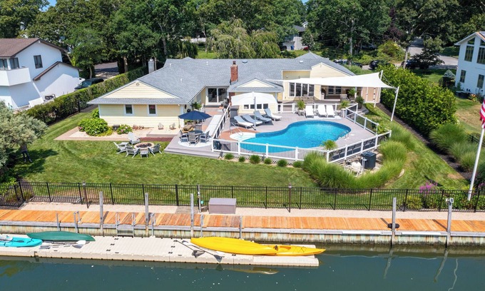 Bring the whole family to this waterfront Hamptons oasis for fun and relaxation. Located in a semi private community the home is built for entertaining with extensive decking that includes an 800 ft sail shade, Lexor lighting, and Sonos system. The multi-tiered deck overlooks the 8 ft deep pool and 120 ft reinforced bulkhead with a 50 ft dock equipped with multiple kayaks. The home includes an in-law suite that features a living room, summer kitchen, 2 bedrooms, full-bath, and private access.