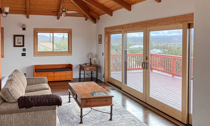 Situated near Sedona, Oak Creek, Beaver Creek, and Camp Verde, this cozy retreat offers stunning sunsets, clear star-filled nights, and daily visits from local wildlife. The property also boasts mountain and valley views, providing a serene backdrop for your stay.