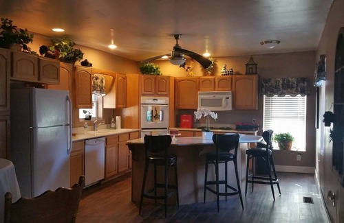 Master bedroom and adjoining bath plus a half bath downstairs. Large kitchen with island for entertaining. Living room with flatscreen TV, DVD player and DVD's along with board games and WiFi for entertainment.