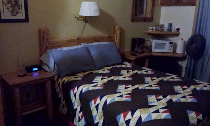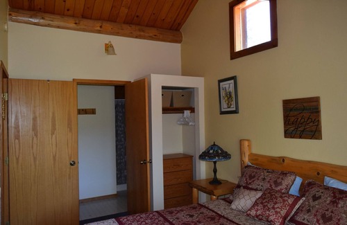Happy Cabin Studio is an upstairs room with a queen and a twin bed. The bedroom area also has a mini fridge, coffee maker, and microwave with a few plates/bowls/cups/utensils provided and a tv with a dvd player. The private bathroom has a stand up shower. Step out the sliding glass door onto the small balcony to enjoy the beauty that surrounds you. Or go for a very short walk to the year round hot tub or take a dip in the seasonal pool or the Methow River that runs along side the resort.