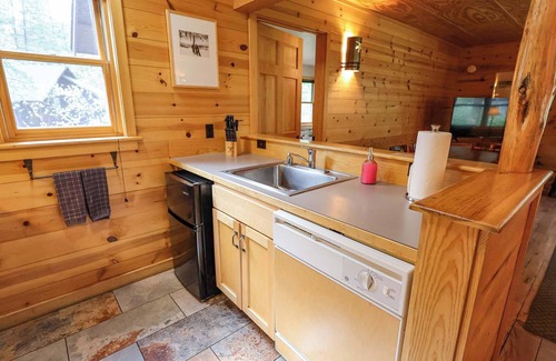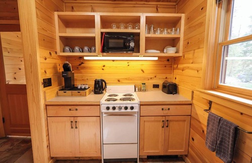 The cabin features two spacious bedrooms, each with corner windows offering serene forest views. The main bedroom has a king bed, while the second bedroom has twin beds. The wood-paneled living room is both inviting and functional, complete with a queen-size fold-out couch, easy chair, dining table for six, a wide-screen TV, and a gas stove. The galley kitchen is well-equipped with everything you need for your stay, including an electric stove, oven, microwave, under-counter refrigerator, sink, and coffee maker. The compact bathroom is outfitted with a shower.
