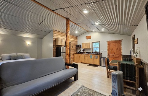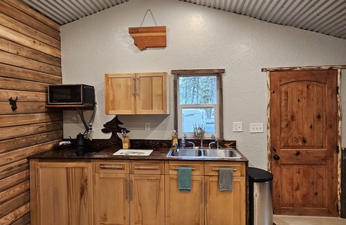 Welcome to our elevated cabin we call the treehouse! It was created from trees taken down on the property. A larch tree runs through the center of it, with many custom wood accents; cedar, fir, larch, lodgepole, and alder. There is 1 queen bed (full bedding included), 1 futon (folds out to accommodate two smaller children (bedding in a bag provided if needed or bring your own sleeping bags), a kitchen with a refrigerator/freezer, a small glass cooktop, provided silverware, plates, cups, pots/pans, water kettle, microwave, a full working bathroom with a shower, sink and toilet. Outside, you will find a fire ring and picnic table. This charming "treehouse" is located next to trails leading to Crystal Lake. Spend your time on the trails, playing in the lake or hanging out at Happy's Inn! Happy's has a great restaurant, bar, a fantastic family friendly backyard, a little store, and washing machines.