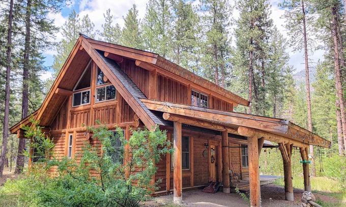 Happy Trails is a log-framed cabin with wrap-around porch and sauna, located in the Upper Methow Valley, close to the outdoor adventure hub of Mazama. The home is well furnished and thoughtfully equipped for vacation stays, with 3 three bedrooms plus additional sleeping-berths on fold-outs and sleeping sofa. Situated on 9 acres of woodland shared with two other cabins, these are among the few area vacation rentals with private riverfront on the property (250 yards from the cabin).