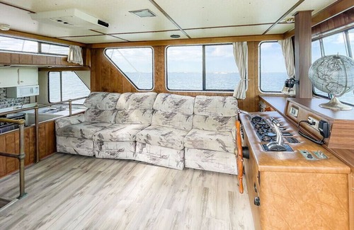 Boating experience is required as you will be out on the water and get yourself to and from the boat. It is important that you are aware that this is a houseboat. Your electric is coming to the form of solar or generator power. There is a water heater and For size shower. There’s also a fridge and microwave. The bed is a sleep number which is adjustable on either side of the bed. There is AC in the bedroom. However the rest of the boat is called with the Ocean breeze in box fans. The top deck is beautiful place to watch sunsets or gaze at the stars. An extra cleaning fee will be charged if dishes are left in the sink or the house is left in very unclean conditions.
