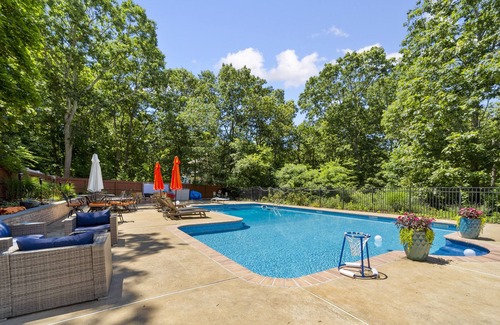 Bring the whole family to this great place with lots of room for fun. Huge backyard with patio and a separate gated private pool, with lots of fun activities, games. on a private road with lots of woods around you, very private yet just around the corner from main street, ice cream, shops, groceries, and more. Take your bike to town or drive. Only 7 minutes from beautiful Westhampton Beach Beaches and more!