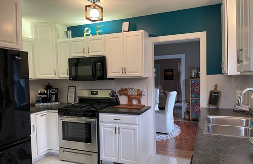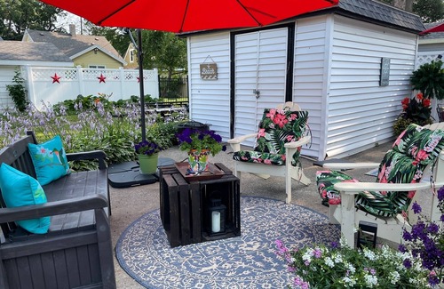 Harbor Home on Miner is an eclectic beachy Bohemian inspired bungalow. Do not let the size fool you. This 4 bedroom freshly renovated home was made for fun. It is perfect for multiply families, in town for summer fun or hockey tournaments, a girls weekend, a golf get-away or a family wedding. This little jewel of a home can handle just about any group. There is even extra room in the main part of the basement for several air mattress as well. The house is fully stocked with cookware and cheery décor, and includes thoughtful touches such as blackout curtains in all of the bedrooms. Each room is also equipped with a dressing vanity, mirror and hair dryer. Beach towels/toys and umbrella for your summer trips to the lake . The outdoor space is perfect for entertaining, having dinner, or enjoying a smore over the fire pit (this is a portable unit) in the evening. The garage has been turned into a Tiki inspired area for more entertaining or a game of cards.