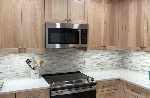 Brand new full natural maple cabinets with quartz tops and dimmable leds