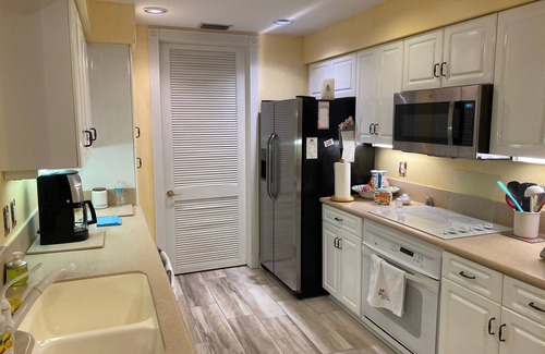 Open floor plan consists of a large living room, dining area, kitchen with bar and half bath. Living room features very comfortable pull out couch that sleeps two. In living room a futon exists for additional guest. Kitchen is fully equipped to prepare and cook all meals. Also includes new washer and dryer. Assigned parking space in parking garage with additional outdoor lot for guests.