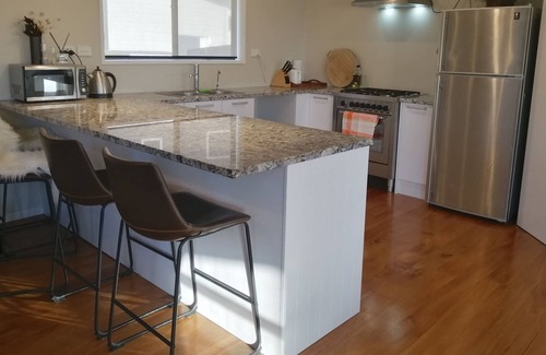 Gas cooking, open plan lounge/kitchen with solid Rimu floors.