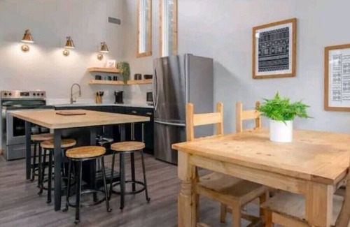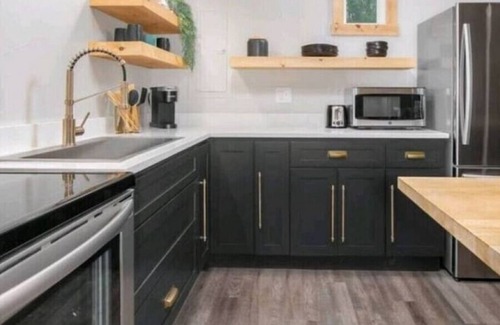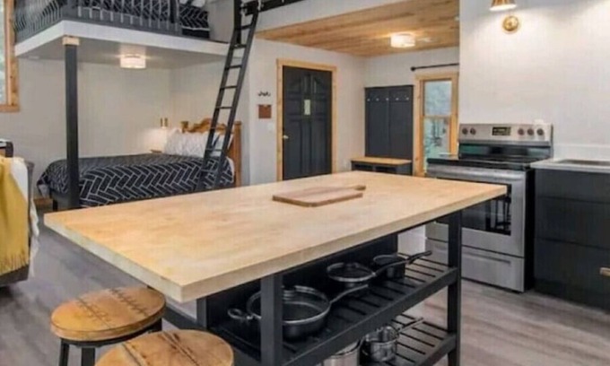 There is just something about rolling out of bed and taking a few steps to the kitchen, starting the coffee and plopping back in bed to watch it brew. The open design lets you watch deer from bed, the sofa, dining or kitchen. Large windows overlook the 5 acre property abundant with trees. There are two beds, one queen size and a full on the platform above. Sleeps 4 but ideal for 2 adults alone or 2 adults and 2 children. 4 persons max for this rental. There is a large island with plenty of pots, pans and cooking utensils. Fridge/freezer, oven, microwave and Keurig are all new and ready for your stay. There is one bathroom with a standup shower, vanity and plenty of towels. Out back is a large patio overlooking the wooded area with table and chairs for a quiet meal. Enjoy outdoor cooking on the propane grill and taking in the view. If you don’t want to be found, this is the cabin for you.