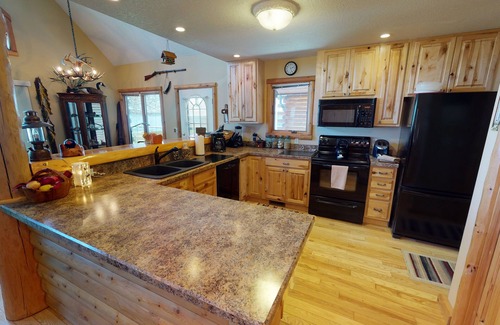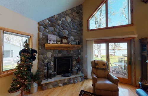 New log cabin on Burt Lake. Has a covered porch and an open deck for relaxing with a beautiful, panoramic view of Burt Lake. Main floor guest room with common bath, Primary bedroom located on second floor with full private bath and loft area in front of door with futon. Enjoy toasting hot dogs and marshmallows around the fire pit. Wildlife decor with mounted animals and an antler chandelier, log and leather furniture, stone fireplace, wood floors and flat screen tv’s.