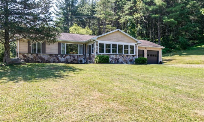 Harlan's Creek Stone Lodge is a 3 bedroom, 2 bath ranch home that sleeps 6comfortably in itspeaceful setting in the heart of the Pennsylvania mountains. This home is the perfect fit for couples and families alike,offering an open dining/living area with Smart TV, WiFi and lots of space to relax in. There is awell-stocked kitchen with plentyof counterspace for all your cooking needs and a laundry room for those extended stays! The primary bedroom features a comfortable queen bed andhas an attached fullbathroom with walk in shower. Relax in the second bedroom with a queen bed or the third with the full-size bed. Each bedroom offers a window AC unit for those hot summer nights. There is a main full bath with a shower/tub combo off a short hallway.Enjoy your mountain vacation rain or shine on the swing in the screened in porch or around the fire pit in the large yard.