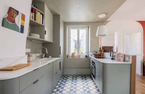 The kitchen, forming the second half of the open-plan living area, showcases green where the living room highlights red: a light teal colour adorns the cabinetry and walls, while a simple white stone countertop tops the counters. With its rounded edges and vivacious geometric floor tiling, this space is an epicentre of character-driven design.