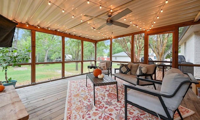 You will feel totally at home in our space whether you're sipping coffee in the covered porch w/ cafe lights, lounging on the oversized couch while you're watching the game, or sitting around the fireplace in the large backyard.
