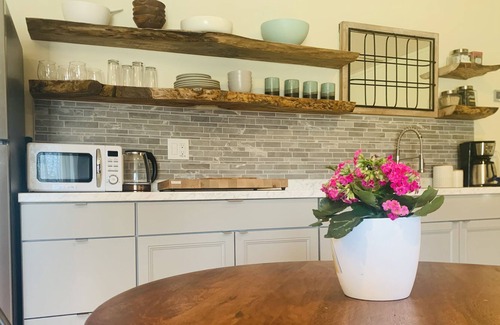 Enjoy this renovated and modern guest studio with a full kitchen + coffee + pantry + private bathroom. Sleeps up to 4 with a comfy queen bed pull-out couch. Adjacent to the peaceful Stone Wave Yoga studio