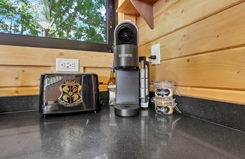 Designed to sleep up to four enchanted guests, the space includes a cozy queen bed on the main floor and then up the ladder in the loft are an additional 2 twin beds. The eat-in kitchenette is equipped with a Keurig coffee maker, microwave, apartment-sized fridge, hot plate, and all the essentials for an easy meal at home. The spa-style bathroom offers a walk-in shower, rustic charm, and complimentary toiletries to make your stay as carefree as possible.