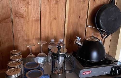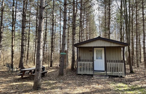 Cozy & peaceful one room cabin located on Finger Lakes Wine Trail / Brew Trail. Private outhouse and outdoor private shower. Clean and setup for couples. OFF THE GRID Glamping at its finest! NO ELECTRICITY OR RUNNING WATER, however we have unique options to accommodate a comfortable stay.