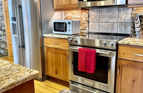 Very comfortable Queen Serta iCloud bed. Knotty pine ceilings, quartzite walls, beautiful Brazilian granite counters, Brazilian cumaru deck. knotty cherry cabinets, Free Wifi. stainless refrigerator, GE Profile stainless convection microwave, Kitchenaide stainless dishwasher, two types of coffee makers (regular and Keurig complete with Kcups), coffee grinder, blender, crock pot, pizza pan, toaster oven, toaster.