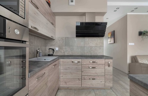The heart of the apartment is a comfortable living room connected to a kitchenette. Here, on a comfortable sofa bed, you can spend time together watching your favorite movies on the 60-inch Smart TV. A fully equipped kitchen with an oven, induction hob, and dishwasher allows you to freely prepare meals together.
