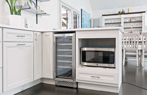 CULINARY CORNER: Fully equipped kitchen, stainless steel appliances, brand new countertops, wine cooler, air fryer, Keurig/drip duo coffee maker, tea kettle, Crock-pot, full knife set, spices, cooking basics, dishware & flatware