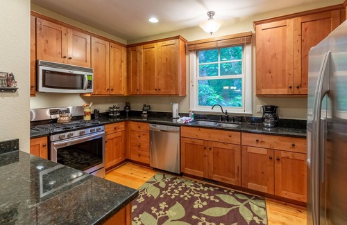 This cozy single-level home features a king bed in the master suite, as well as a queen and two twins in the guest rooms. With the addition of the queen-sized sleeper sofa in the living room, this cottage comfortably sleeps eight. Pets are also welcome.