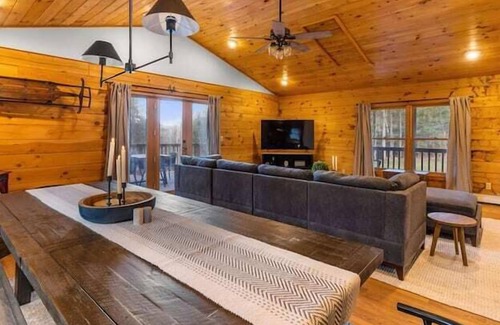 Log cabin tucked away on the side of the mountain with wooded views in every room. On the first floor you will find airy living room with sliders to an oversized deck and large dining area that's able to host 8 or more people. Additionally, you will find a comfortable primary bedroom with ensuite bathroom connecting to a private office/flex room. The second floor offers two bedrooms (one with another TV!) equipped with queen beds and another bathroom.
