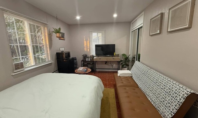 Welcome to your stylish Hawthorne escape! Just 12 mins to SoFi & LAX, 25 mins to DTLA & iconic beaches like Manhattan, Hermosa & Venice. Enjoy a bedroom and a shared bathroom in a home with a comfy queen bed, futon couch (opens to bed), workspace, smart TV, and Keurig coffee bar. Relax on the private patio under swaying palms or play a board game inside. Perfect for up to 3 guests. Clean, modern, and central—your perfect LA stay!