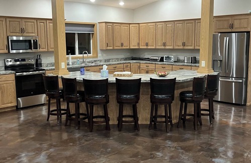 Make yourself at home in this 4-bedroom Pollock retreat. This lodge boasts 4 queen beds, 2 bathrooms with showers, and convenient amenities like a washing machine, WiFi, heating, and AC. The tremendous space offers a beautiful setting for guests to relax and unwind. We hope you enjoy what our place and Pollock has to offer. Two separate common areas , 3 big screen televisions with satellite service , full service kitchen ,reclining sofas and chairs can provide sleeping for 10 additional guests , large climate controlled garage available for an extra $50 per night