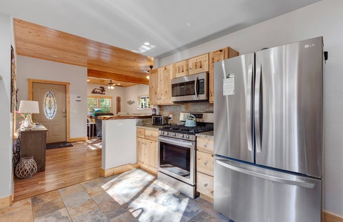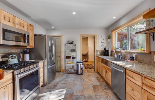 Kitchen has farm house sink w/granite countertop's, Pine cabinets with everything you would need for cooking or baking. Fully equipped "salt, pepper, olive oil, and seasonings all provided all you need to do is bring your favorite food.