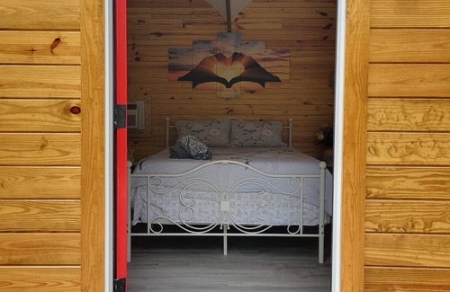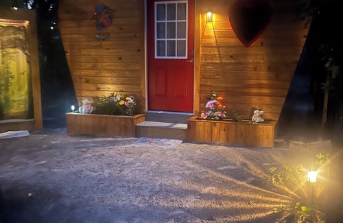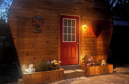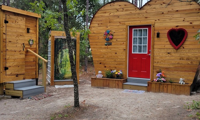 Welcome to a custom handcrafted heart shaped cabin in the secluded woods. Imagine staying in this heart shaped cabin in peaceful serenity with your loved one. after sunset, sit under screened-in patio with the peaceful flame from the fire pit, while eating the meal from the barbecue. At nights end, relax in an outdoor heated shower with a stary sky view. The Heart Cabin is more than just a cozy retreat- It's a sanctuary of Love. No internet, TV, only you & your honey. Talk, laugh. & reconnect.